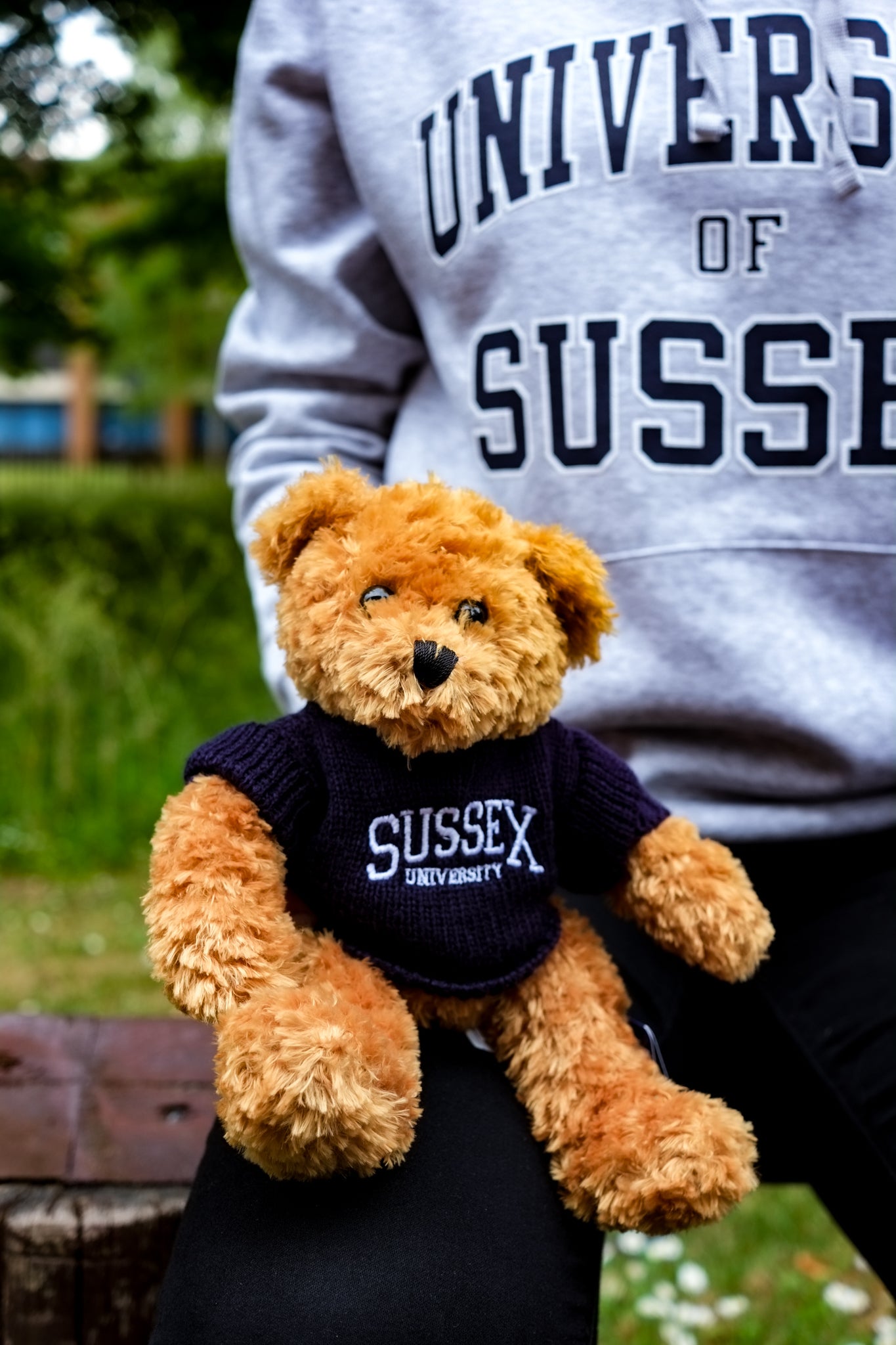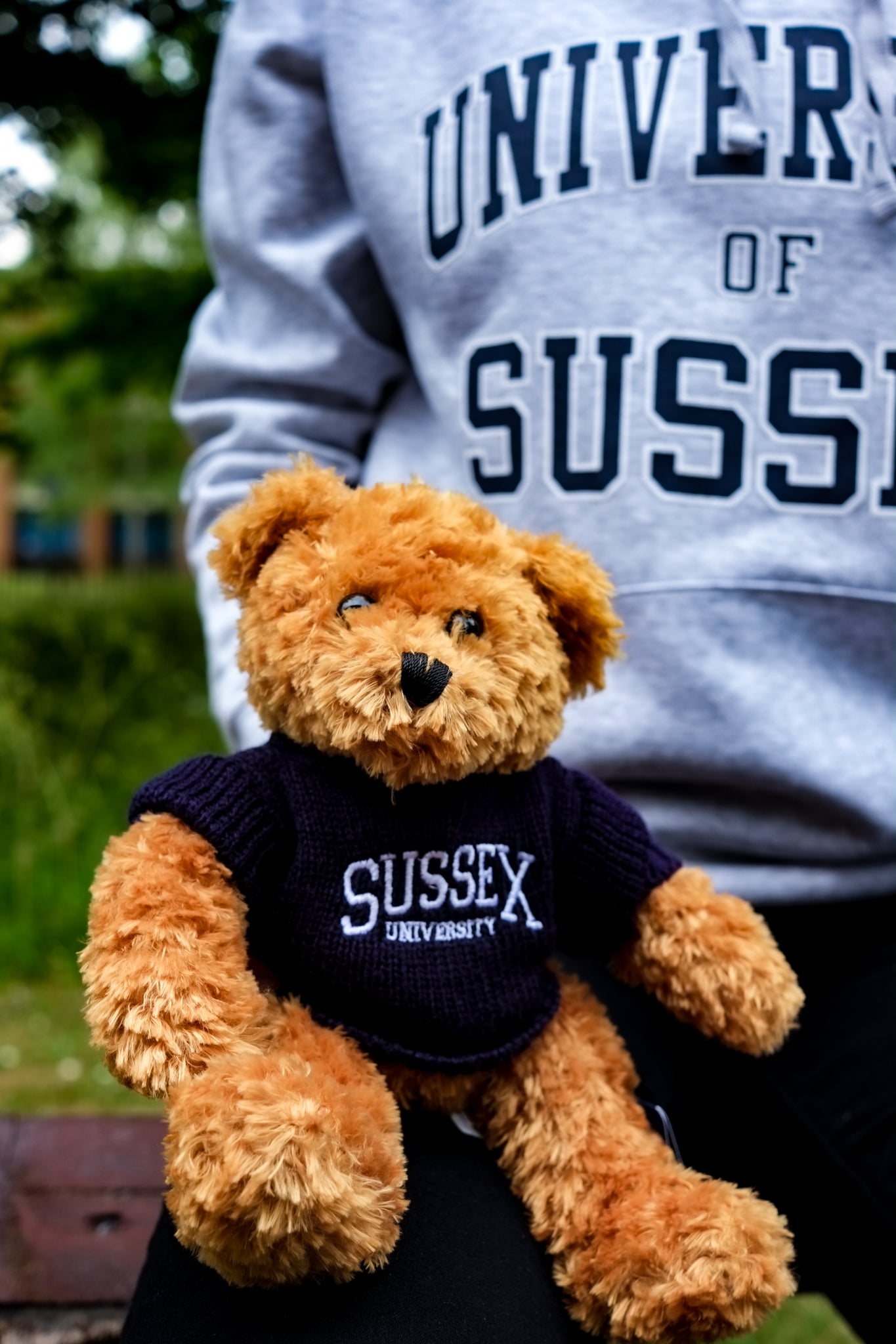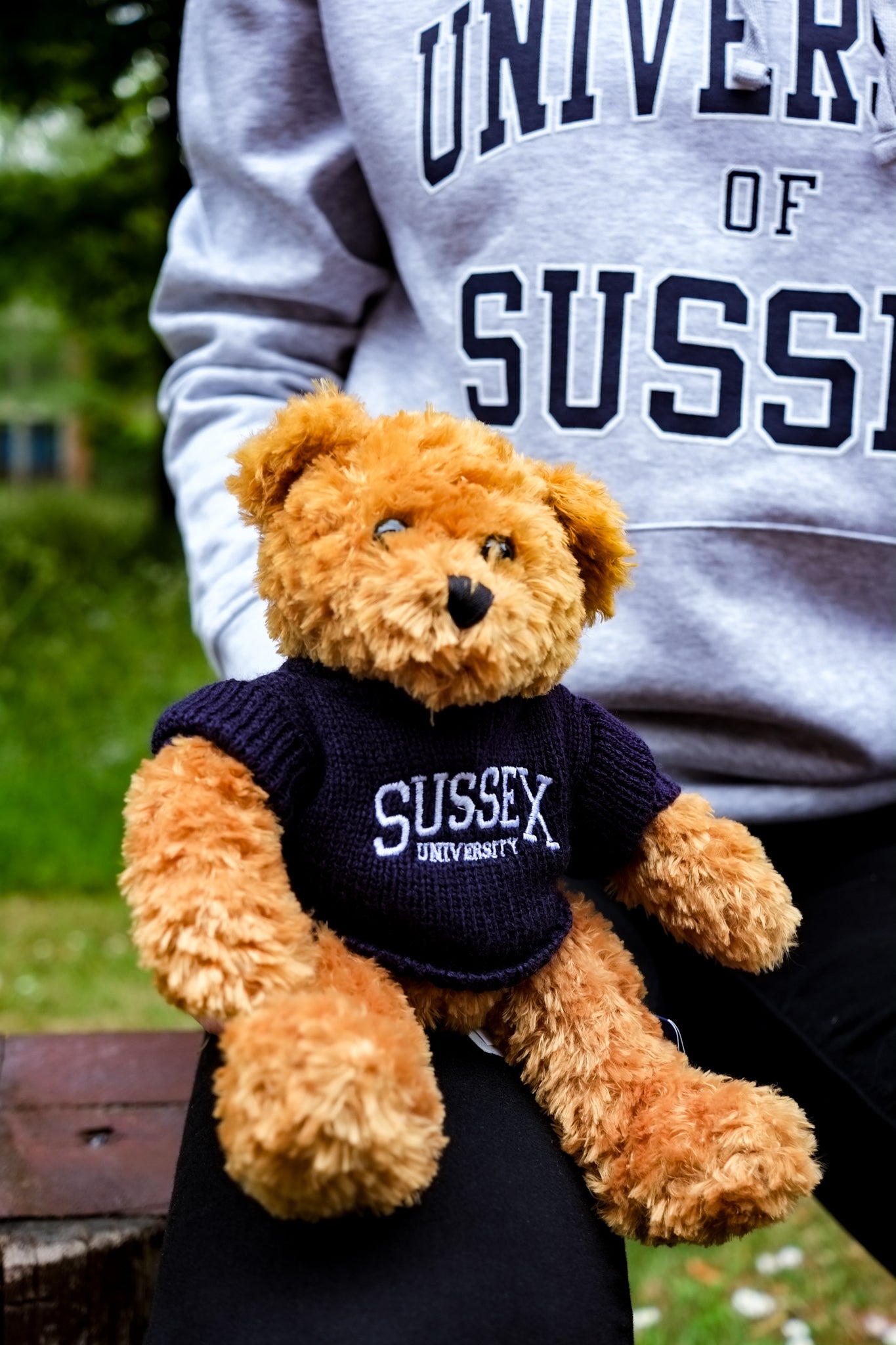 Our little Toffee bear. Proudly wearing a Sussex Uni jumper, Toffee loves to show their association with our University.- They even have a weighted bottom which means that they can sit comfortably on any hard surface at home. But they are equally hug-gable.