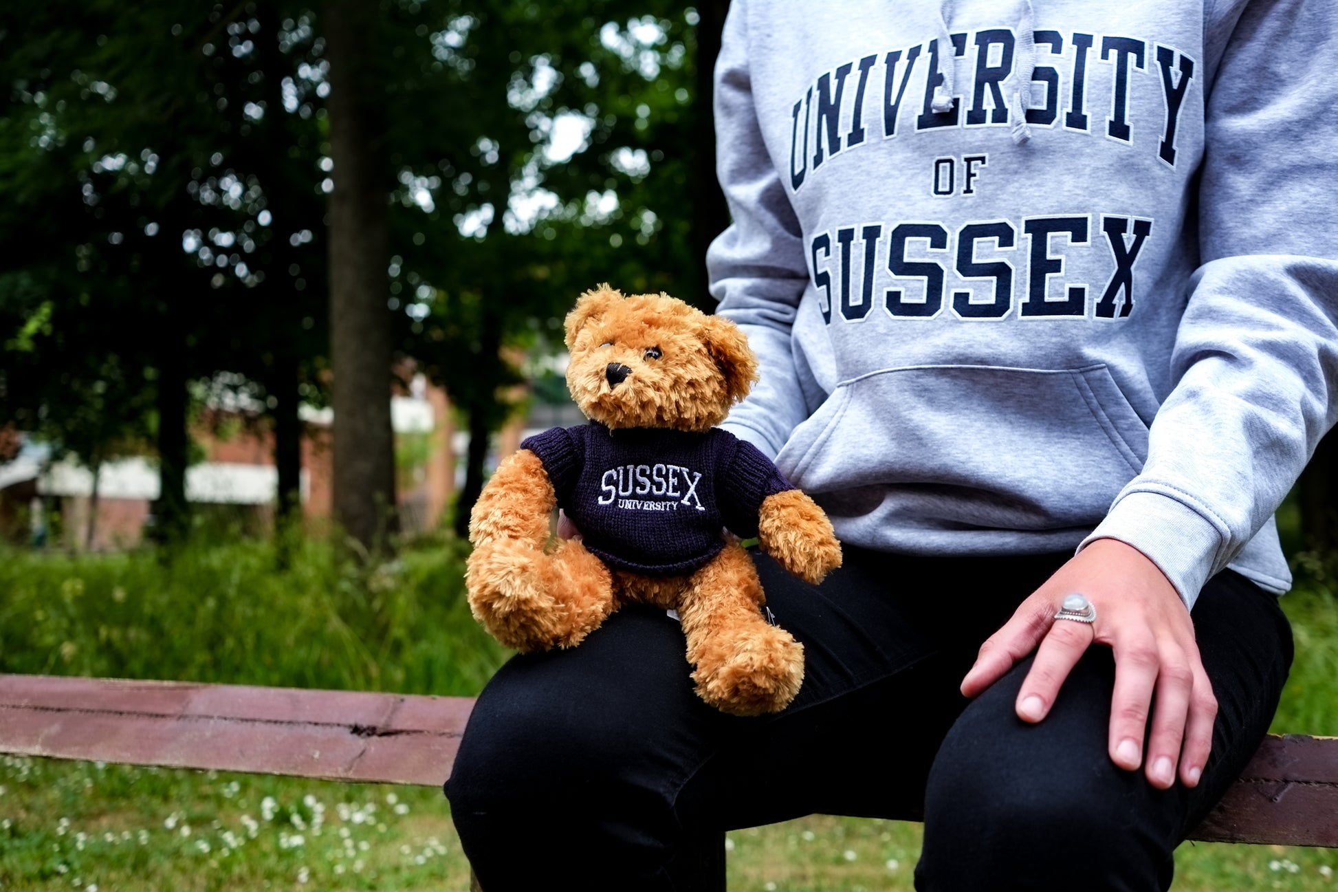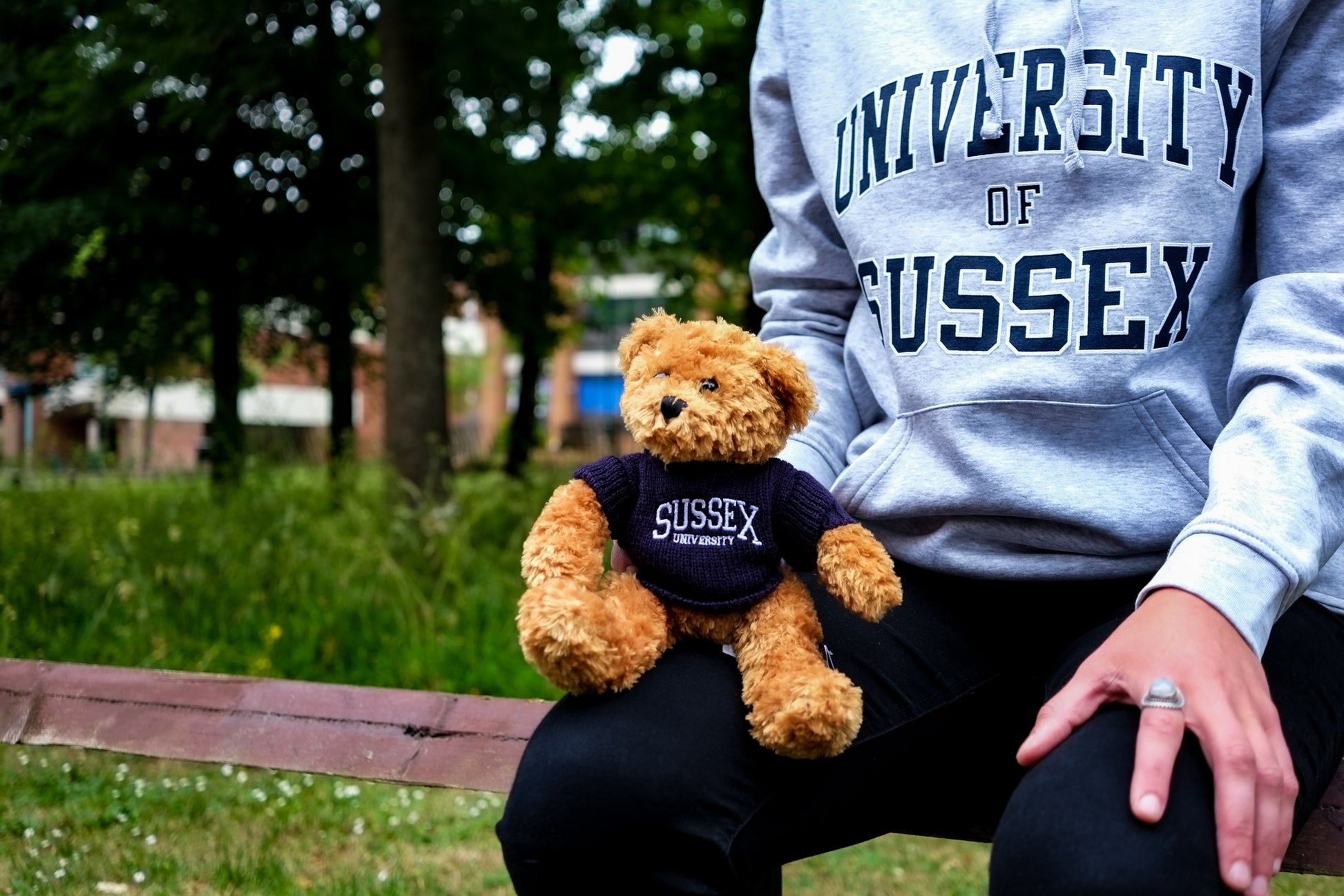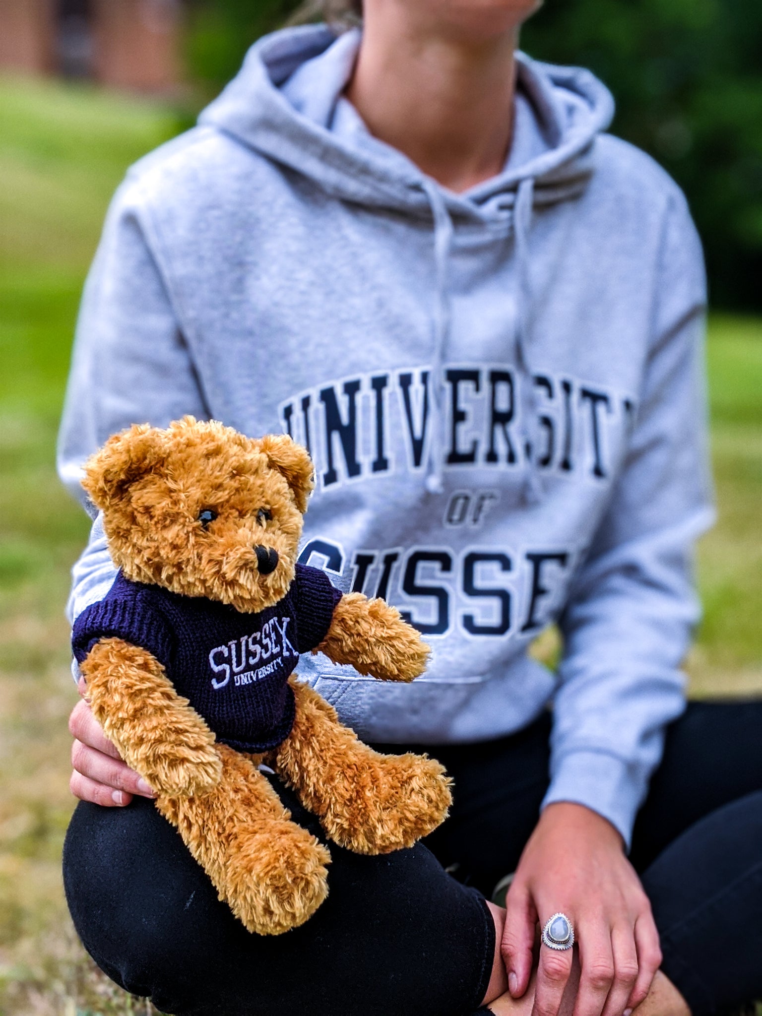 Our little Toffee bear. Proudly wearing a Sussex Uni jumper, Toffee loves to show their association with our University.- They even have a weighted bottom which means that they can sit comfortably on any hard surface at home. But they are equally hug-gable.